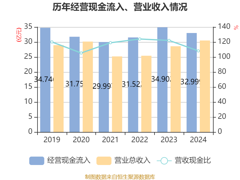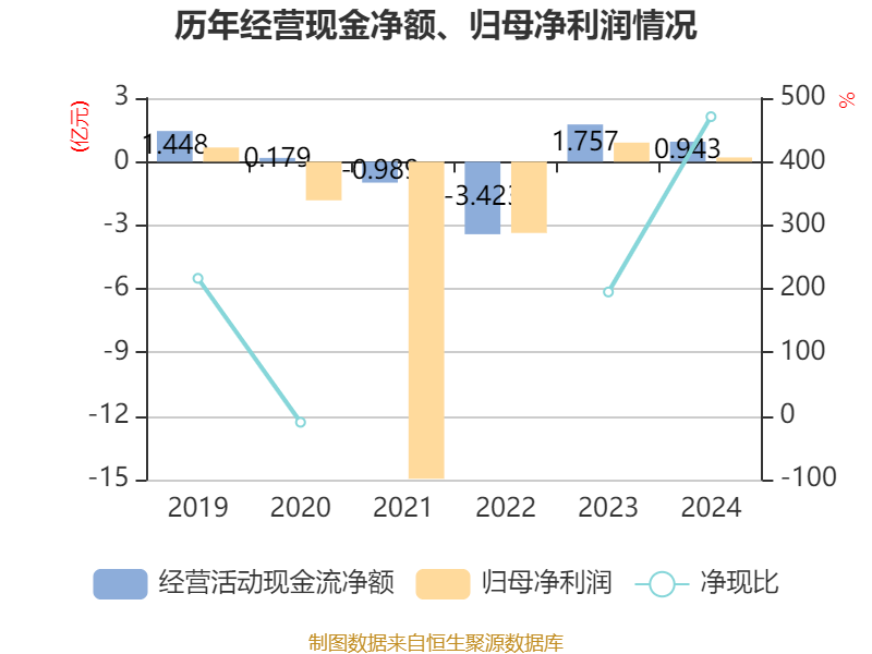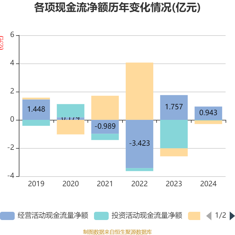 截至2024年,公司经营活动现金流净额为9429.47万元,同比下降46.34%;筹资活动现金流净额-2584.01万元,同比增加3117.84万元;投资活动现金流净额-382.94万元,上年同期为-2.02亿元。