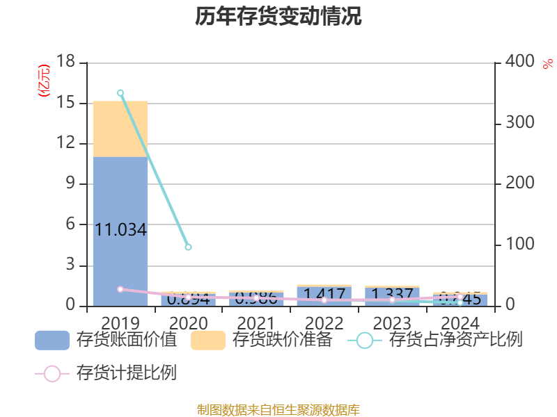 从存货变动来看,截至2024年末,公司存货账面价值为8447.42万元,占净资产的5.1%,较上年末减少4921.8万元。其中,存货跌价准备为1492.9万元,计提比例为15.02%。