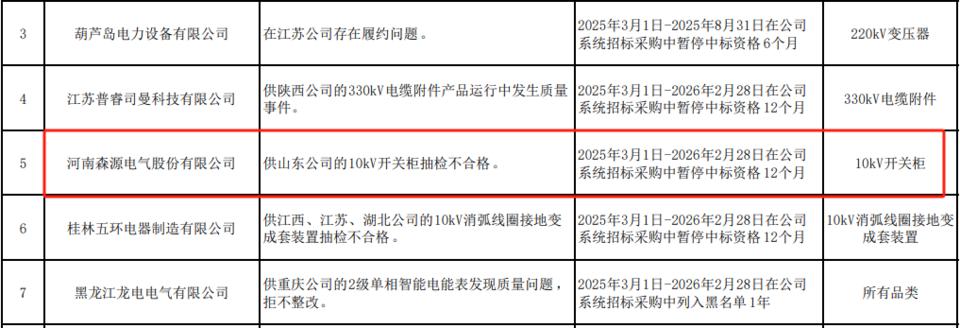 据国家电网公告的不良行为描述显示,森源电气供山东公司的10kV开关柜抽检不合格。处理措施为:2025年3月1日—2026年2月28日在公司系统招标采购中暂停中标资格12个月。处理范围为:10kV开关柜。