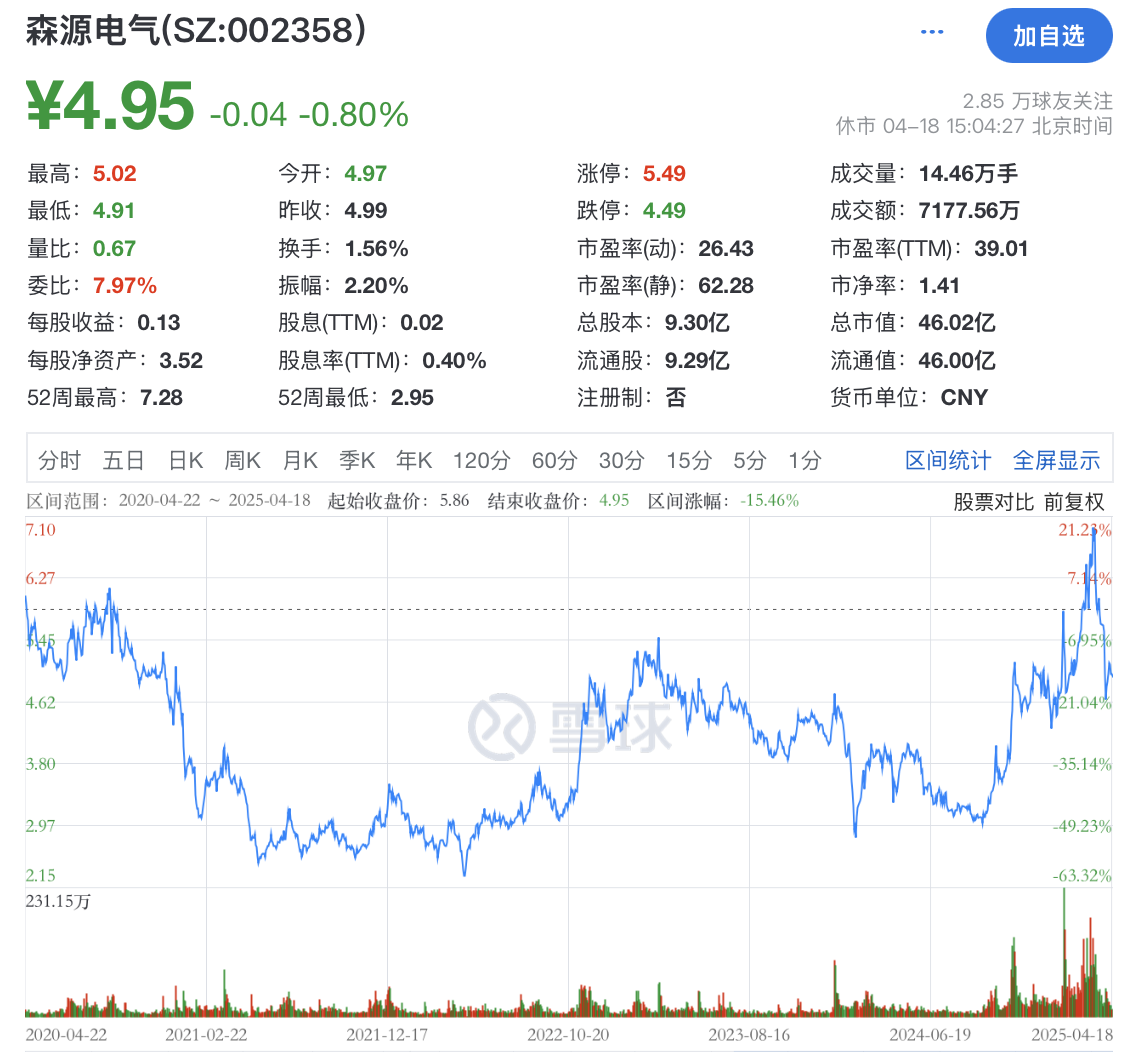 森源电气最新股价报4.95元/股,总市值46.02亿元。该股近5年股价“坐过山车”,整体跌去15%。