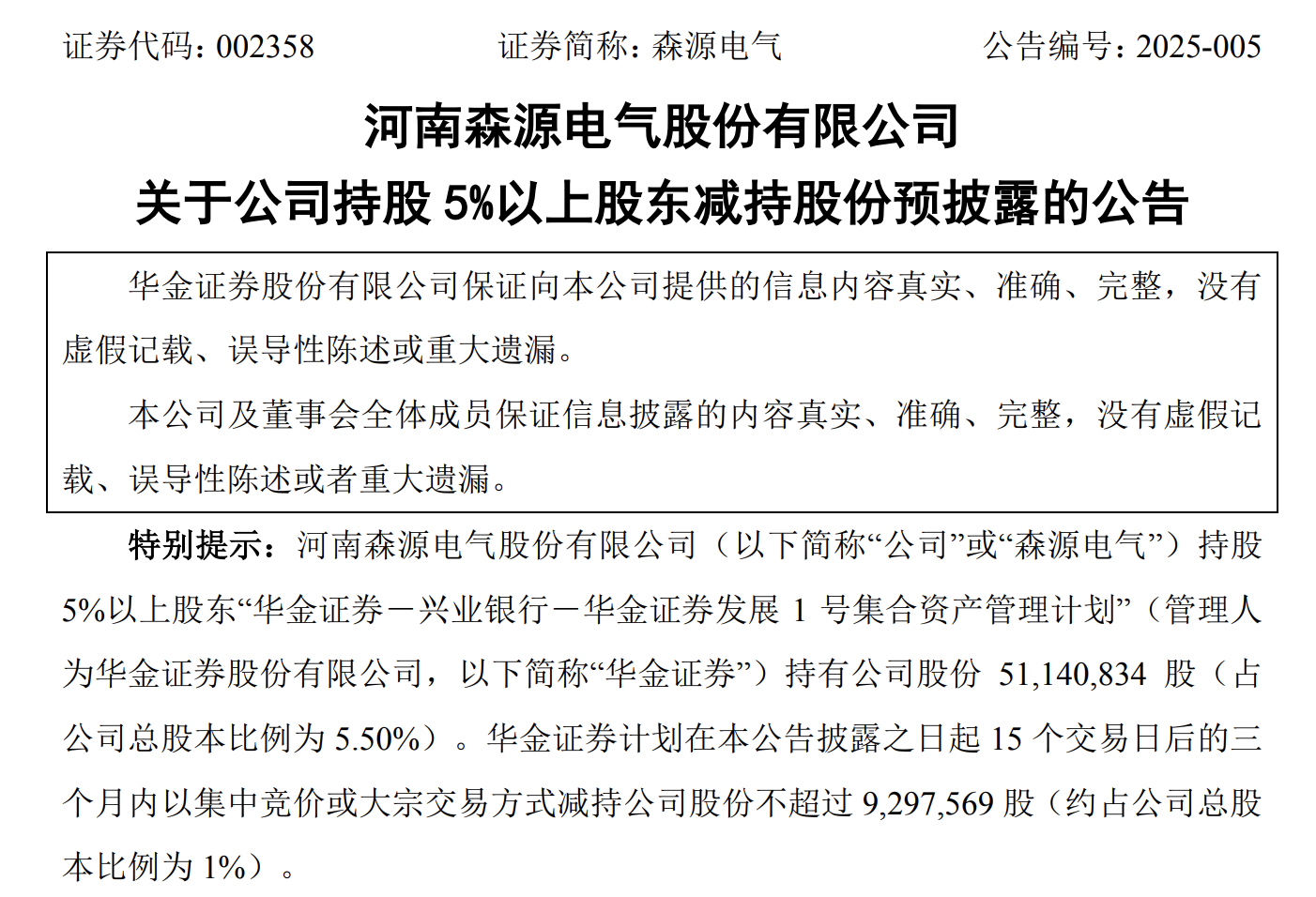 若此次减持按计划上限完成,华金证券持有森源电气的比例将低于5%,将退出大股东的行列。
