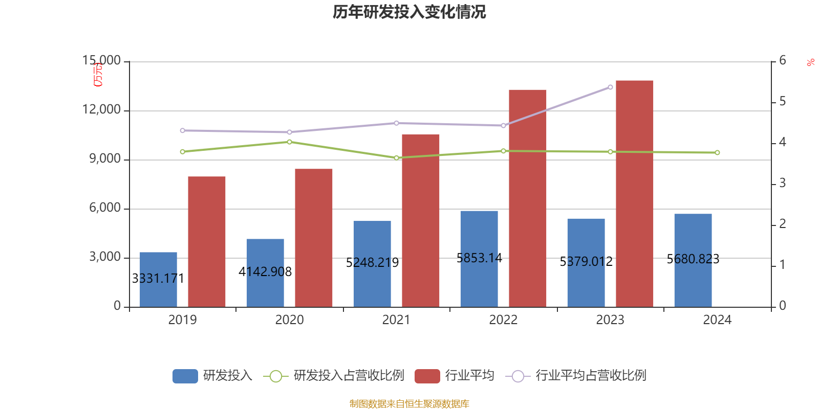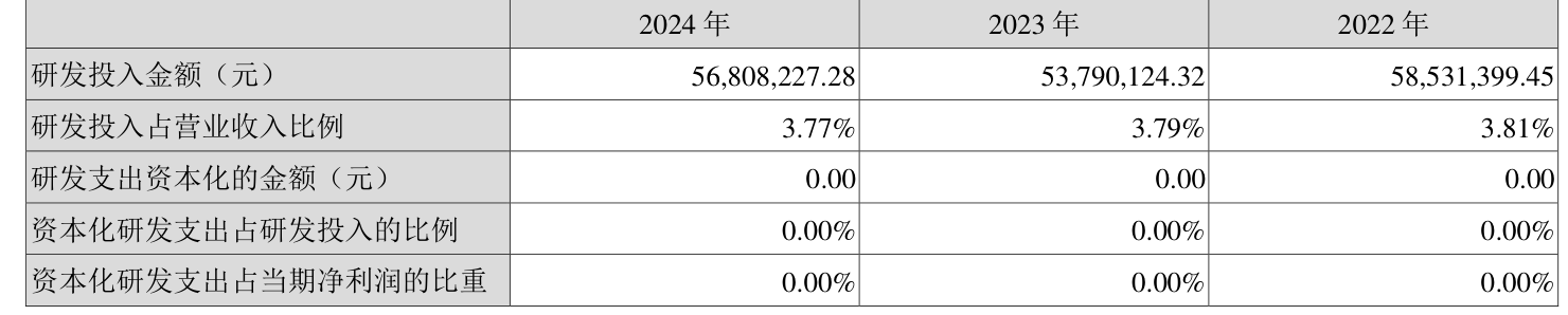 2024年全年,公司研发投入金额为5680.82万元,同比增长5.61%;研发投入占营业收入比例为3.77%,相比上年同期下降0.02个百分点。此外,公司全年研发投入资本化率为0%。