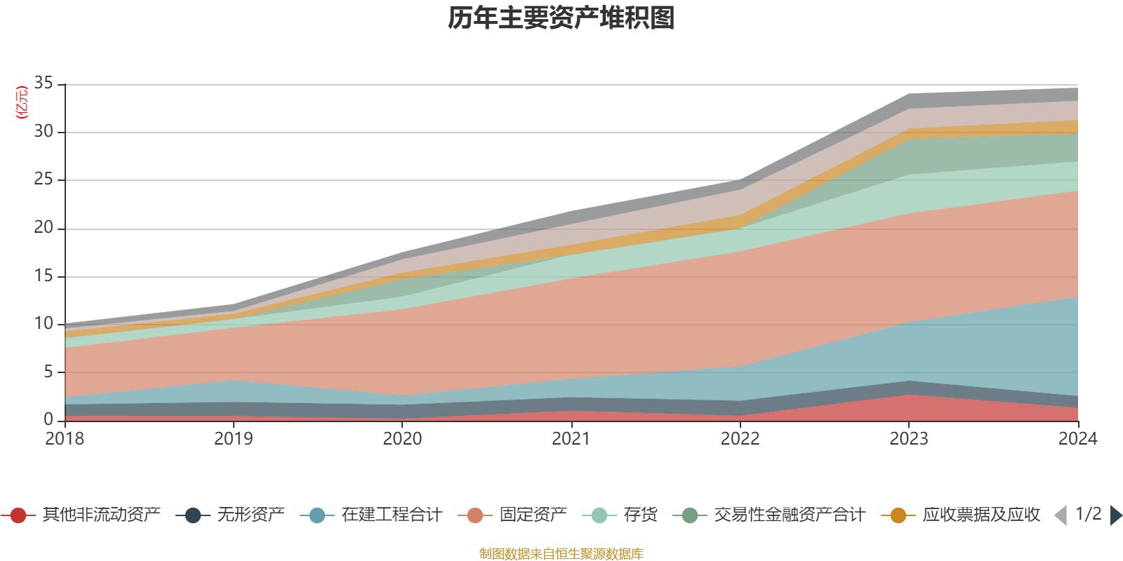 资产重大变化方面,截至2024年末,公司在建工程合计较上年末增加68.76%,占公司总资产比重上升11.83个百分点;其他非流动资产较上年末减少50.55%,占公司总资产比重下降4.1个百分点;存货较上年末减少24.41%,占公司总资产比重下降3.04个百分点;交易性金融资产合计较上年末减少22.14%,占公司总资产比重下降2.55个百分点。