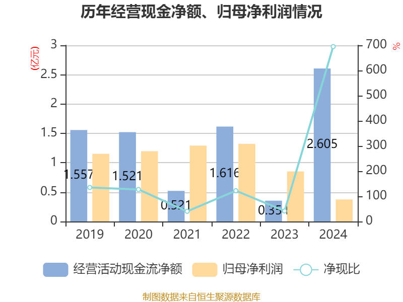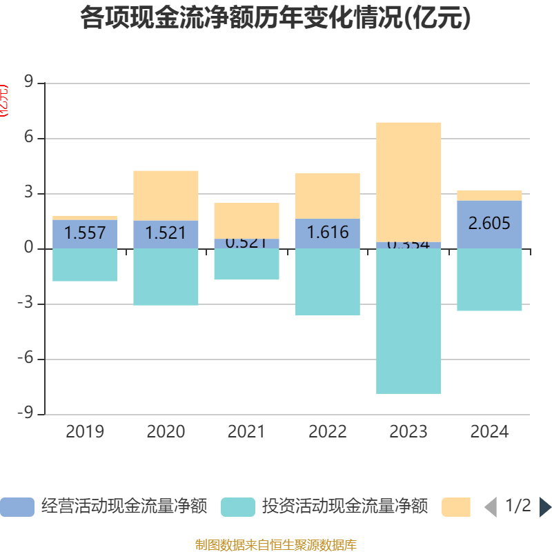 截至2024年,公司经营活动现金流净额为2.61亿元,同比增长634.96%;筹资活动现金流净额5459.98万元,同比减少5.94亿元;投资活动现金流净额-3.39亿元,上年同期为-7.91亿元。
