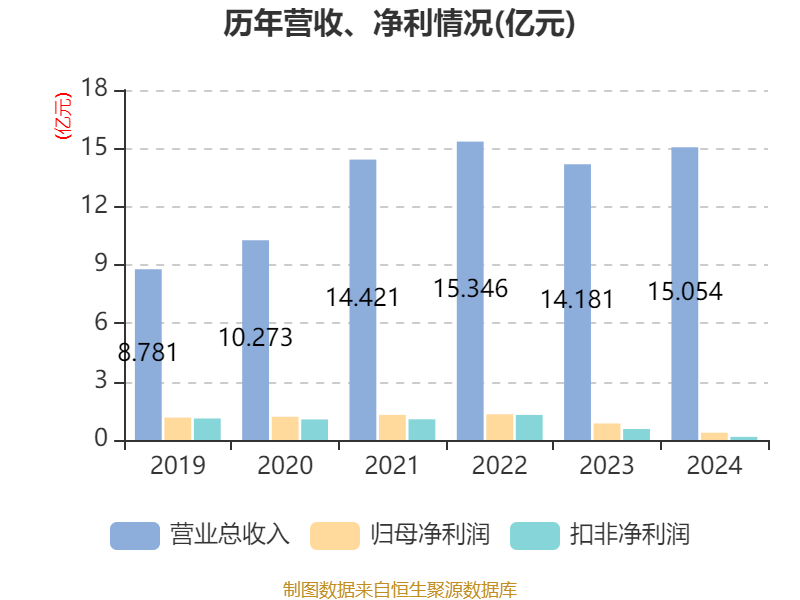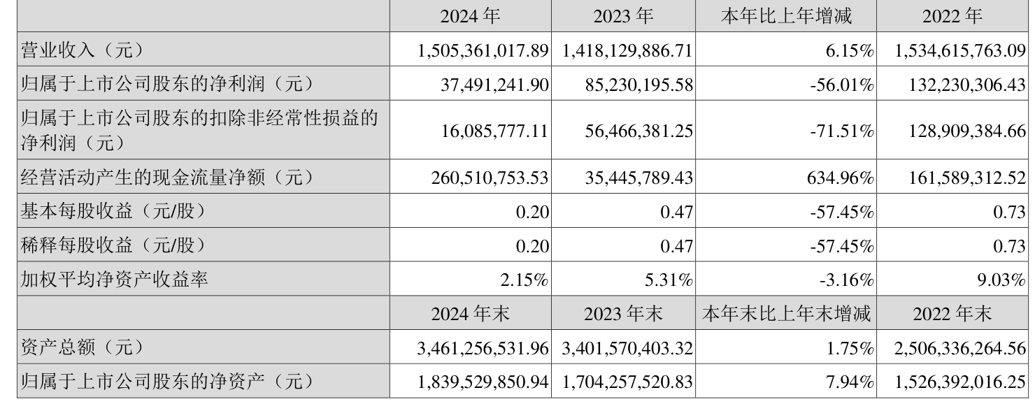 中证智能财讯金丹科技(300829)4月21日披露2024年年度报告。2024年,公司实现营业总收入15.05亿元,同比增长6.15%;归母净利润3749.12万元,同比下降56.01%;扣非净利润1608.58万元,同比下降71.51%;经营活动产生的现金流量净额为2.61亿元,同比增长634.96%;报告期内,金丹科技基本每股收益为0.2元,加权平均净资产收益率为2.15%。公司2024年度分配预案为:拟向全体股东每10股派现0.5元(含税)。