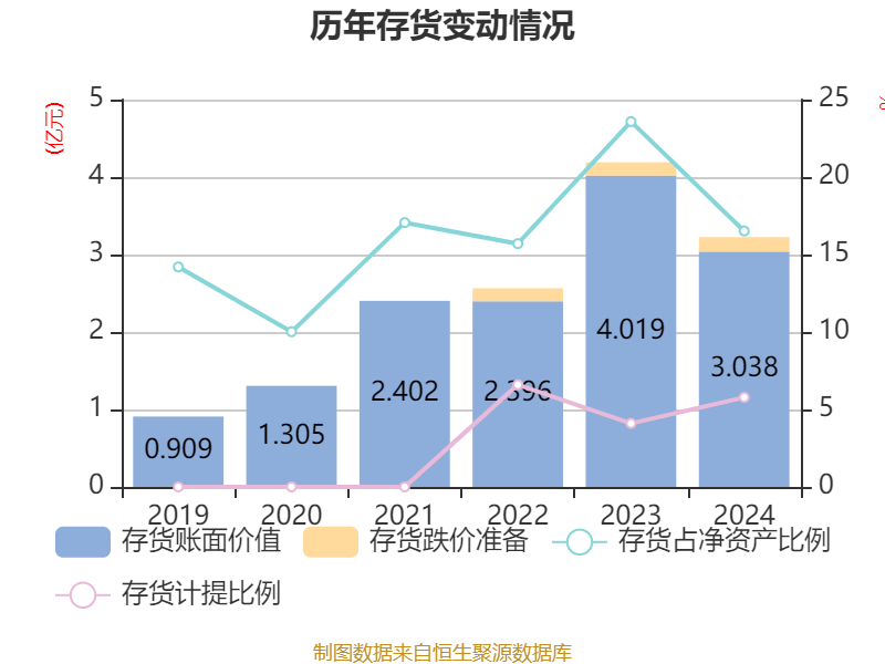 从存货变动来看,截至2024年末,公司存货账面价值为3.04亿元,占净资产的16.52%,较上年末减少9810.88万元。其中,存货跌价准备为1862.71万元,计提比例为5.78%。