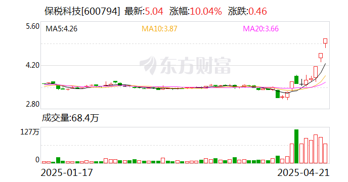保税科技盘中涨停,已连收3个涨停板,截至9:32,该股报5.04元,换手率4.96%,成交量5956.98万股,成交金额2.94亿元,涨停板封单金额为1.73亿元。连续涨停期间,该股累计上涨33.33%,累计换手率为20.78%。最新A股总市值达60.49亿元。