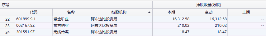 据统计,截至一季度末,阿布扎比投资局共现身紫金矿业、东方锆业和无限传媒3只股票前十大流通股股东名单,持股数量分别为1.63亿股、210万股、18.47万股。值得注意的是,阿布扎比投资局均是今年一季度新进入上述3只股票的前十大流通股股东名单。