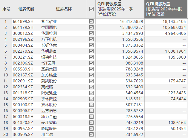 Choice数据显示,根据已披露的上市公司一季报,截至今年一季度末,QFII共进入43只股票前十大流通股股东名单。其中,QFII持有紫金矿业和中国西电的股票数量最多,分别为1.63亿股、1.54亿股;此外,QFII持有华测检测、方正电机(维权)、长虹华意、华明装备、银禧科技的数量分别为3434.8万股、1556万股、1357万股、1324.9万股。