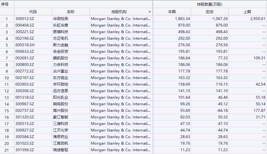 除了中东资本,摩根士丹利、巴克莱银行、高盛等外资巨头也积极在A股市场进行布局。Choice数据显示,根据已披露的上市公司一季报,截至一季度末,摩根士丹利现身21只股票前十大流通股股东名单。其中,长虹华意、银禧科技、方正电机、新力金融等多只个股均为一季度新进。