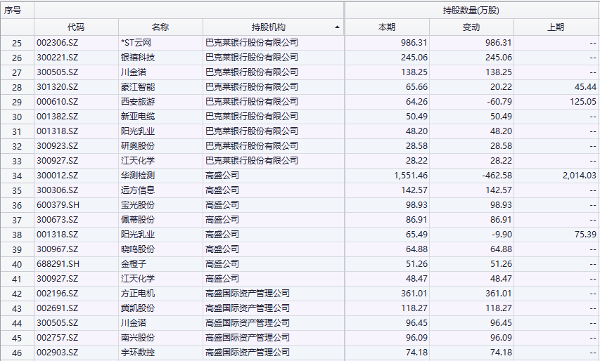同源数据还显示,巴克莱银行现身银禧科技、川金诺等9家公司前十大流通股股东名单;高盛现身华测检测、远方信息、宝光股份、佩蒂股份等13家公司前十大流通股股东名单。