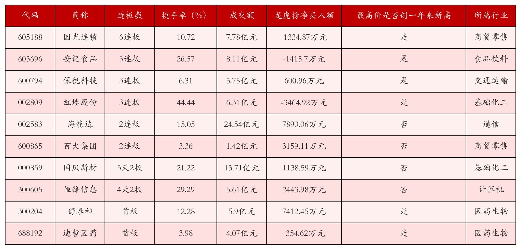截至4月21日收盘,上证综指上涨0.45%,收于3291.43点,深证成指上涨1.27%,收于9905.53点,创业板指上涨1.59%,收于1944.32点。今日沪深两市A股共计114只涨停,综合当前连板数以及当日龙虎榜数据,其中较为强势的前三只个股分别为:国光连锁(605188)、安记食品(603696)与保税科技(600794)。今日强势个股前10位具体数据见下表: