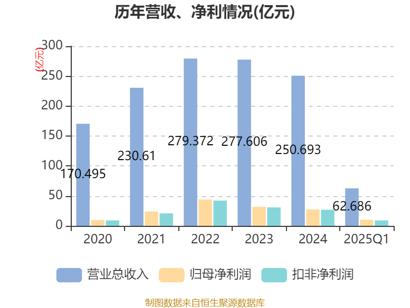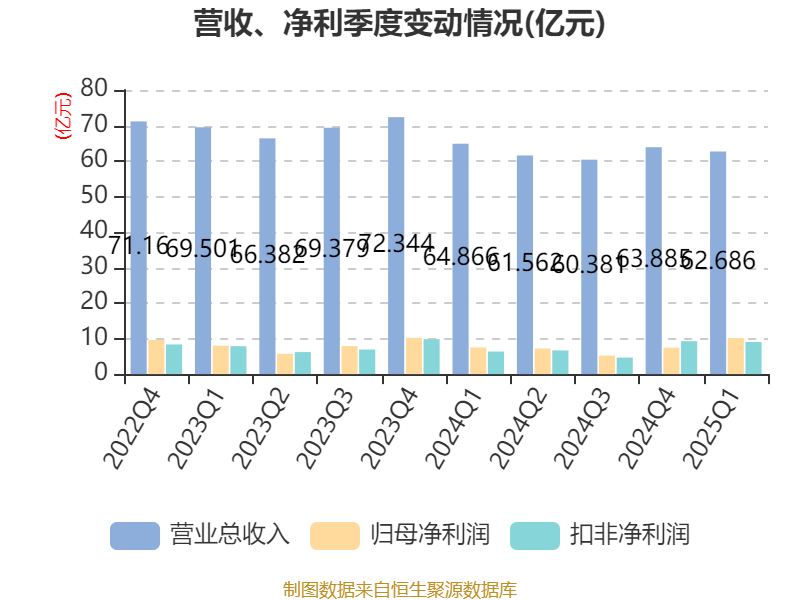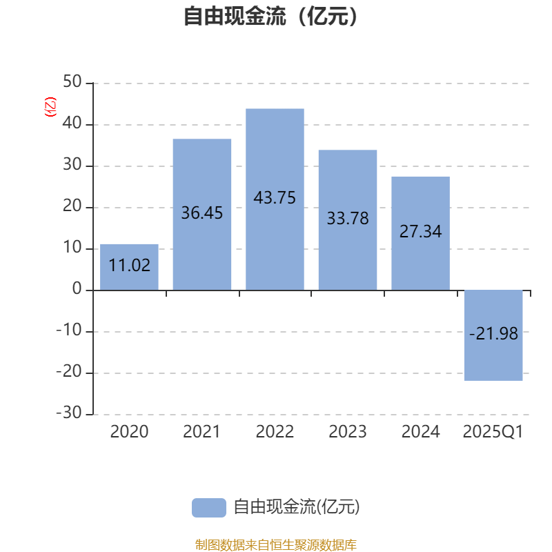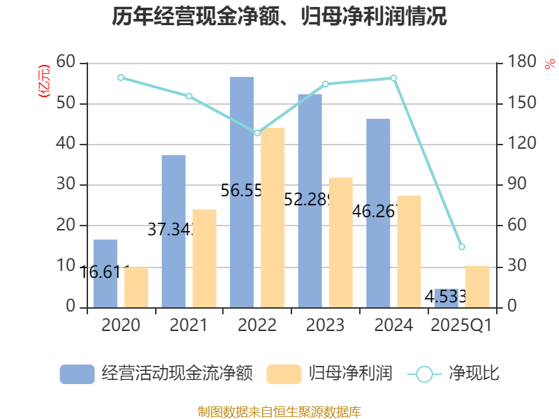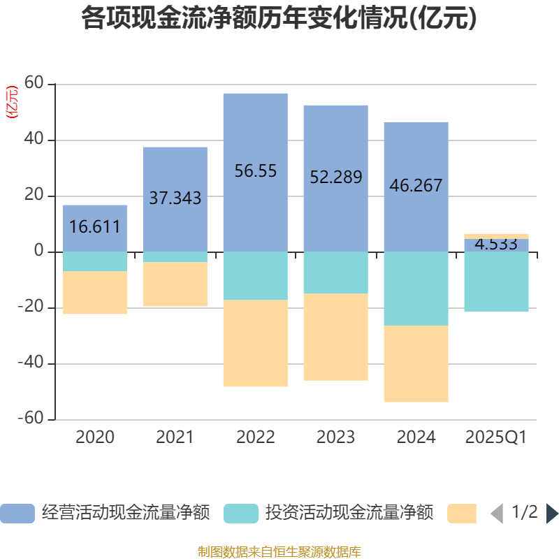 截至2025年一季度末,公司经营活动现金流净额为4.53亿元,同比增加4.84亿元;筹资活动现金流净额1.76亿元,同比增加1580.55万元;投资活动现金流净额-21.51亿元,上年同期为-4.92亿元。