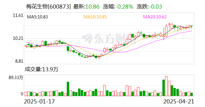 中证智能财讯梅花生物(600873)4月22日披露2025年第一季度报告。公司实现营业总收入62.69亿元,同比下降3.36%;归母净利润10.19亿元,同比增长35.52%;扣非净利润9.05亿元,同比增长42.07%;经营活动产生的现金流量净额为4.53亿元,上年同期为-3040.24万元;报告期内,梅花生物基本每股收益为0.36元,加权平均净资产收益率为6.78%。