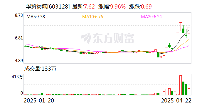 华贸物流再度涨停,6个交易日内录得4个涨停,累计涨幅为27.42%,累计换手率为81.07%。截至9:36,该股今日成交量1.02亿股,成交金额7.61亿元,换手率7.81%。最新A股总市值达99.75亿元。