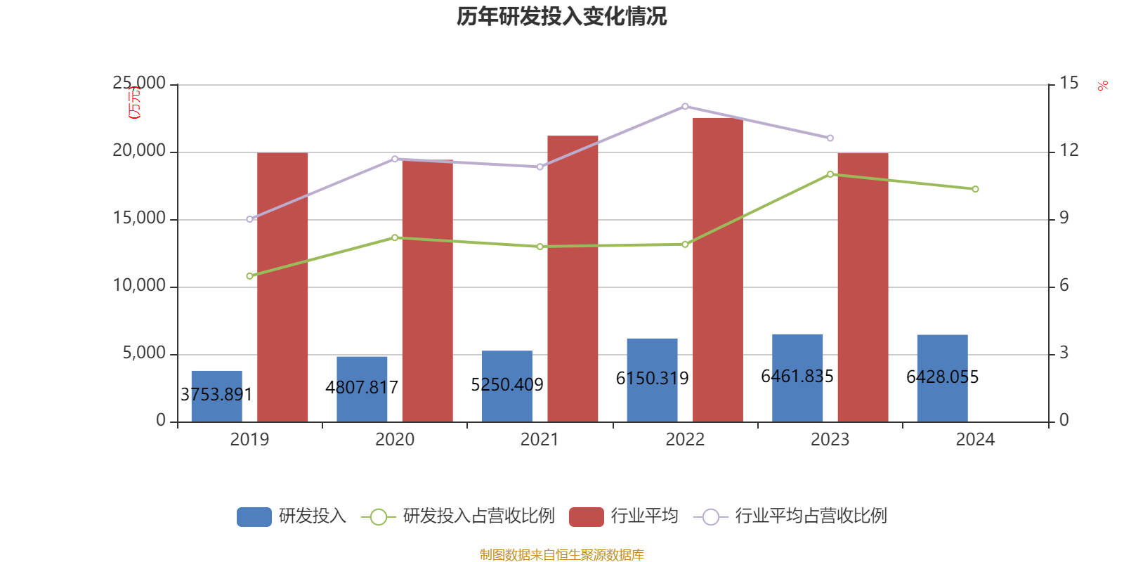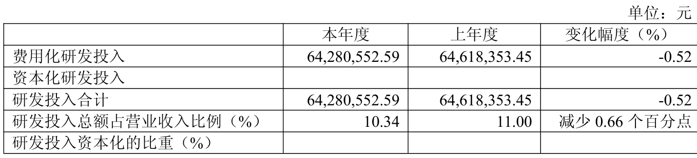 2024年全年,公司研发投入金额为6428.06万元,同比下降0.52%;研发投入占营业收入比例为10.34%,相比上年同期下降0.66个百分点。