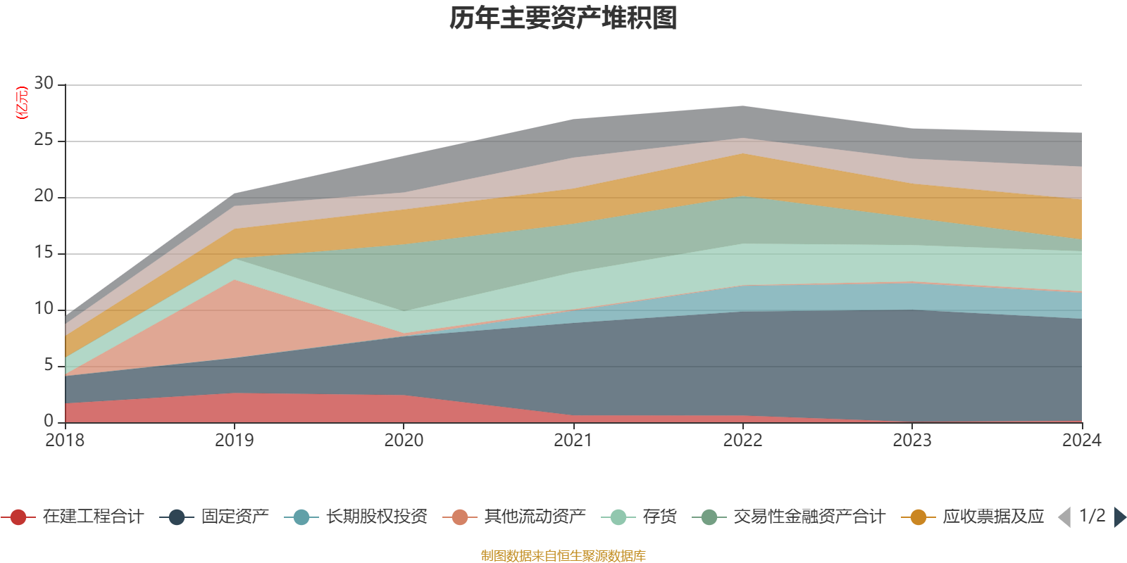 资产重大变化方面,截至2024年末,公司交易性金融资产合计较上年末减少56.67%,占公司总资产比重下降5.22个百分点;固定资产较上年末减少9.1%,占公司总资产比重下降2.97个百分点;货币资金较上年末增加31.47%,占公司总资产比重上升2.84个百分点;应收票据及应收账款较上年末增加17.08%,占公司总资产比重上升2.18个百分点。