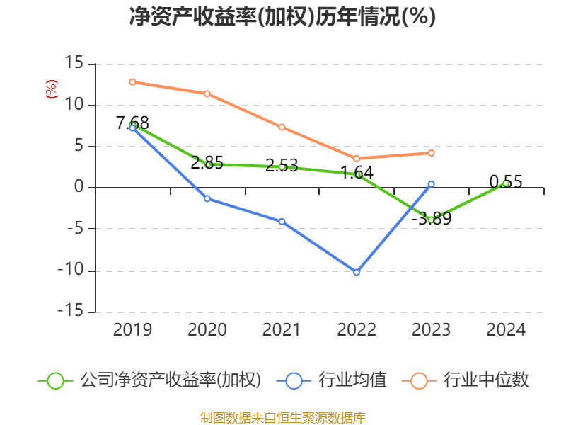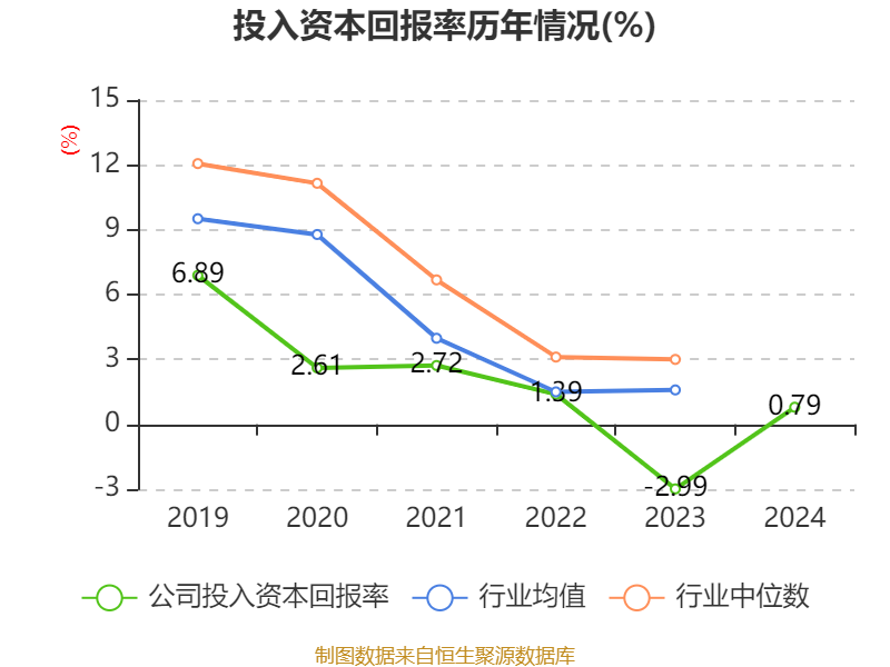 数据显示,2024年公司加权平均净资产收益率为0.55%,较上年同期上升4.44个百分点。公司2024年投入资本回报率为0.79%,较上年同期上升3.78个百分点。