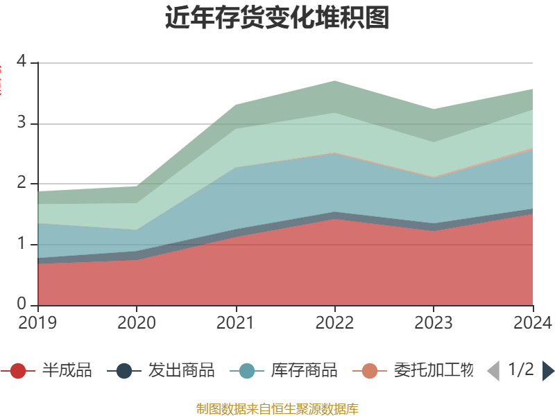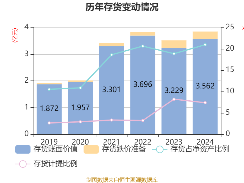 从存货变动来看,截至2024年末,公司存货账面价值为3.56亿元,占净资产的20.96%,较上年末增加3325.45万元。其中,存货跌价准备为2836.09万元,计提比例为7.38%。