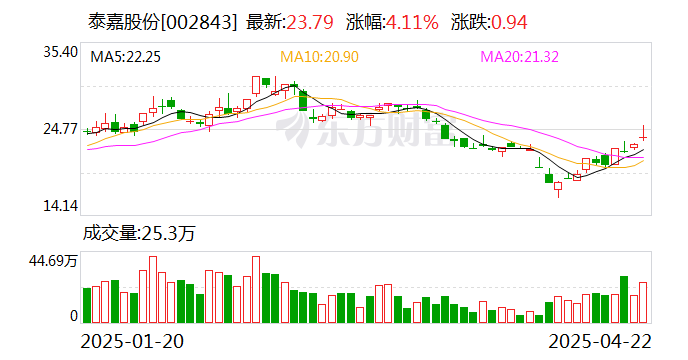 泰嘉股份再度涨停,7个交易日内录得3个涨停,累计涨幅为30.60%,累计换手率为52.93%。截至9:48,该股今日成交量1395.99万股,成交金额3.38亿元,换手率5.57%。最新A股总市值达63.88亿元,A股流通市值63.05亿元。
