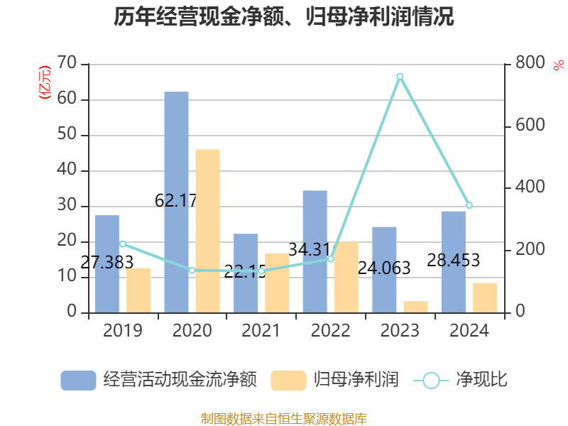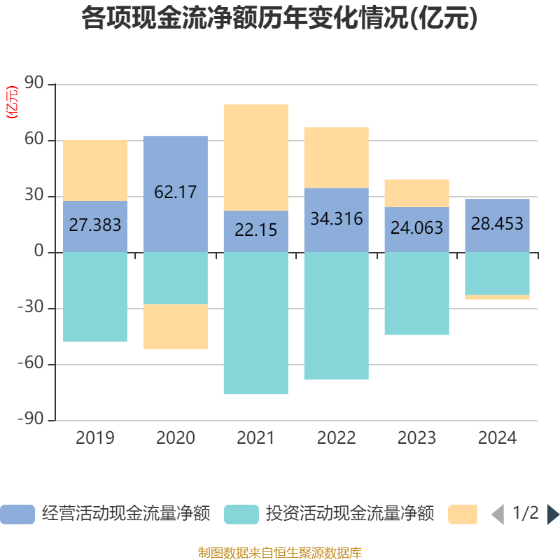 截至2024年,公司经营活动现金流净额为28.45亿元,同比增长18.24%;筹资活动现金流净额-2.4亿元,同比减少17.16亿元;投资活动现金流净额-23.06亿元,上年同期为-44.39亿元。