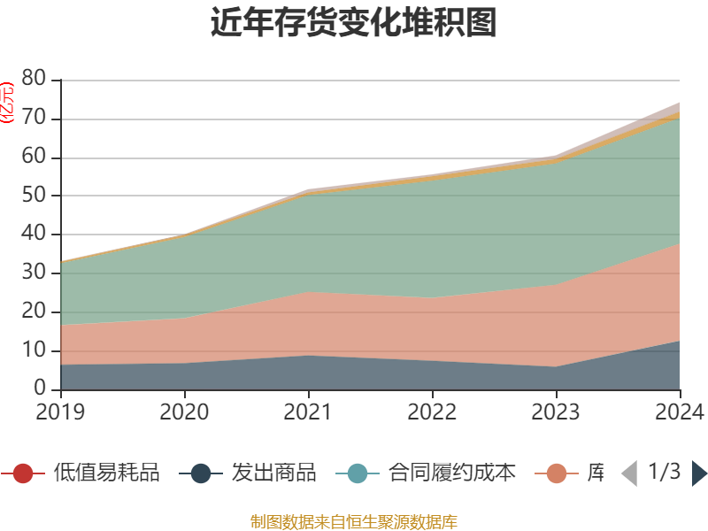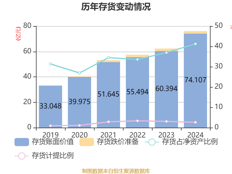 从存货变动来看,截至2024年末,公司存货账面价值为74.11亿元,占净资产的41.26%,较上年末增加13.71亿元。其中,存货跌价准备为1.99亿元,计提比例为2.61%。