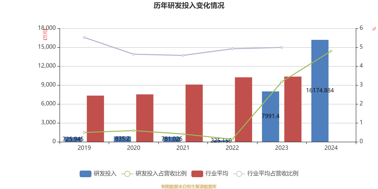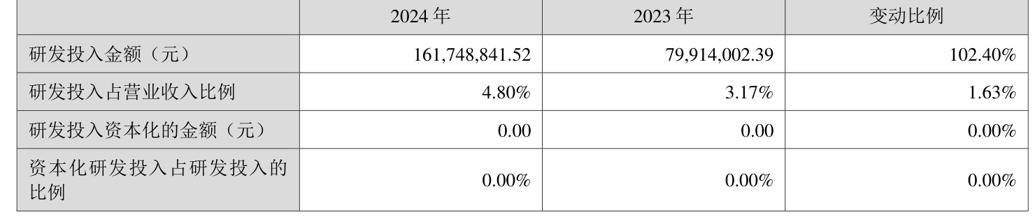 2024年全年,公司研发投入金额为1.62亿元,同比增长102.4%;研发投入占营业收入比例为4.8%,相比上年同期上升1.63个百分点。此外,公司全年研发投入资本化率为0%。