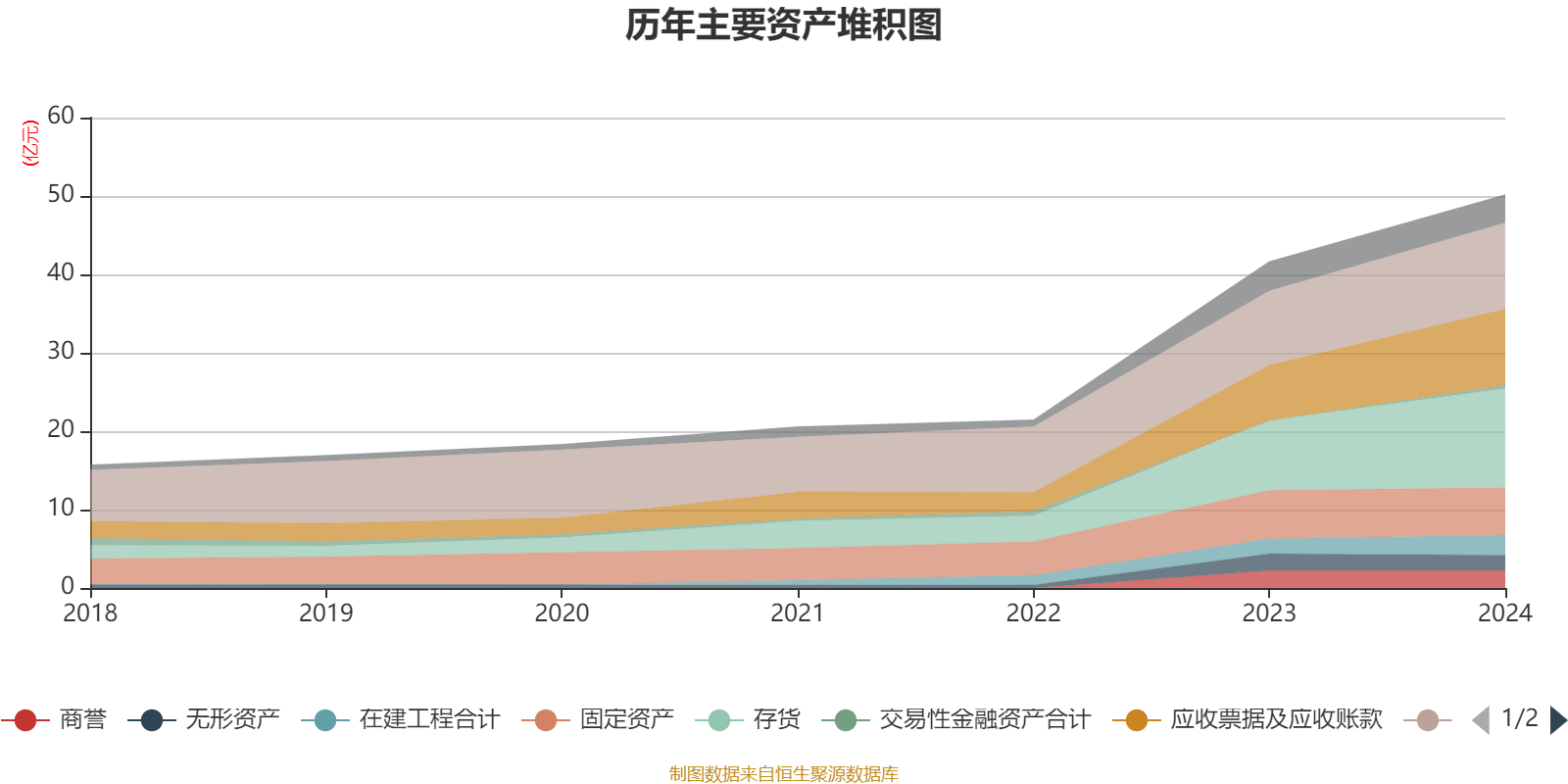 资产重大变化方面,截至2024年末,公司存货较上年末增加41.71%,占公司总资产比重上升3.77个百分点;固定资产较上年末减少2.27%,占公司总资产比重下降2.8个百分点;应收款项融资较上年末减少85.2%,占公司总资产比重下降2.62个百分点;应收票据及应收账款较上年末增加37.77%,占公司总资产比重上升2.44个百分点。