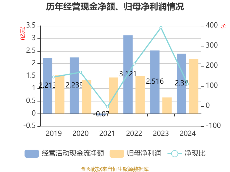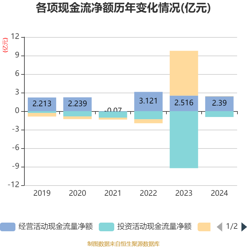 截至2024年,公司经营活动现金流净额为2.39亿元,同比下降4.99%;筹资活动现金流净额433.13万元,同比减少7.21亿元;投资活动现金流净额-9458.88万元,上年同期为-9.23亿元。