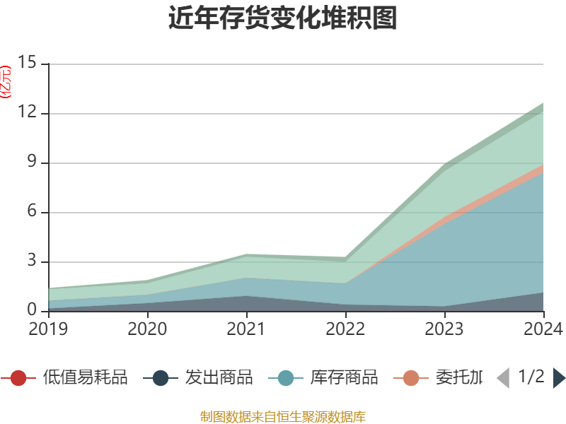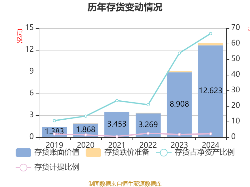 从存货变动来看,截至2024年末,公司存货账面价值为12.62亿元,占净资产的66.44%,较上年末增加3.72亿元。其中,存货跌价准备为2766.28万元,计提比例为2.14%。