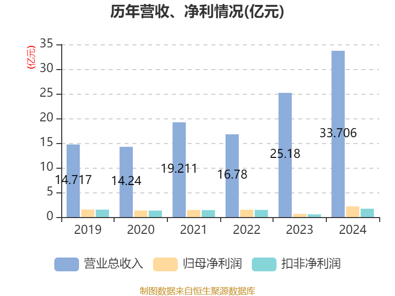 中证智能财讯通润装备(维权)(002150)4月22日披露2024年年度报告。2024年,公司实现营业总收入33.71亿元,同比增长33.86%;归母净利润2.17亿元,同比增长237.28%;扣非净利润1.7亿元,同比增长208.18%;经营活动产生的现金流量净额为2.39亿元,同比下降4.99%;报告期内,通润装备基本每股收益为0.61元,加权平均净资产收益率为12.29%。公司2024年度分配预案为:拟向全体股东每10股派现1元(含税)。