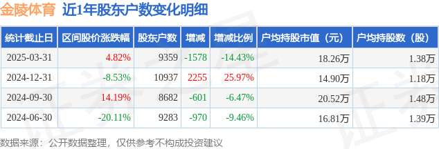 从股价来看,2024年12月31日至2025年3月31日,金陵体育区间涨幅为4.82%,在此期间股东户数减少1578.0户,减幅为14.43%。