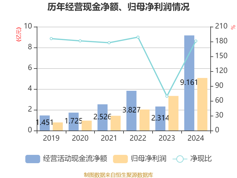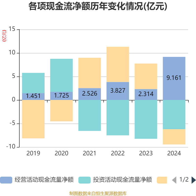 截至2024年,公司经营活动现金流净额为9.16亿元,同比增长295.89%;筹资活动现金流净额-3.24亿元,同比减少8.66亿元;投资活动现金流净额-6.22亿元,上年同期为-8.26亿元。