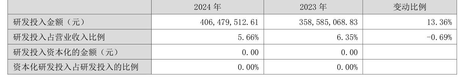 2024年全年,公司研发投入金额为4.06亿元,同比增长13.36%;研发投入占营业收入比例为5.66%,相比上年同期下降0.69个百分点。此外,公司全年研发投入资本化率为0%。