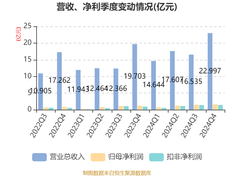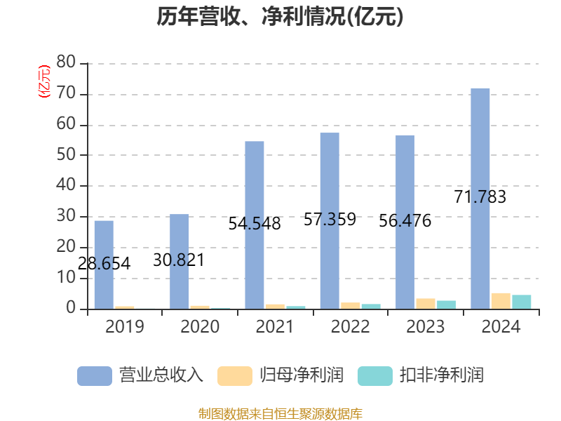 中证智能财讯软控股份(002073)4月23日披露2024年年度报告。2024年,公司实现营业总收入71.78亿元,同比增长27.10%;归母净利润5.06亿元,同比增长51.94%;扣非净利润4.49亿元,同比增长70.95%;经营活动产生的现金流量净额为9.16亿元,同比增长295.89%;报告期内,软控股份基本每股收益为0.499元,加权平均净资产收益率为9.26%。公司2024年度分配预案为:拟向全体股东每10股派现1元(含税)。