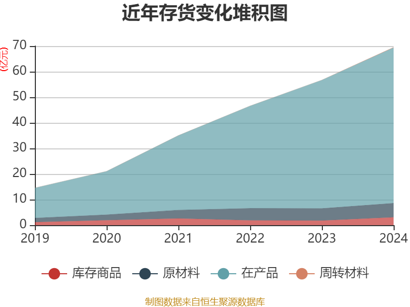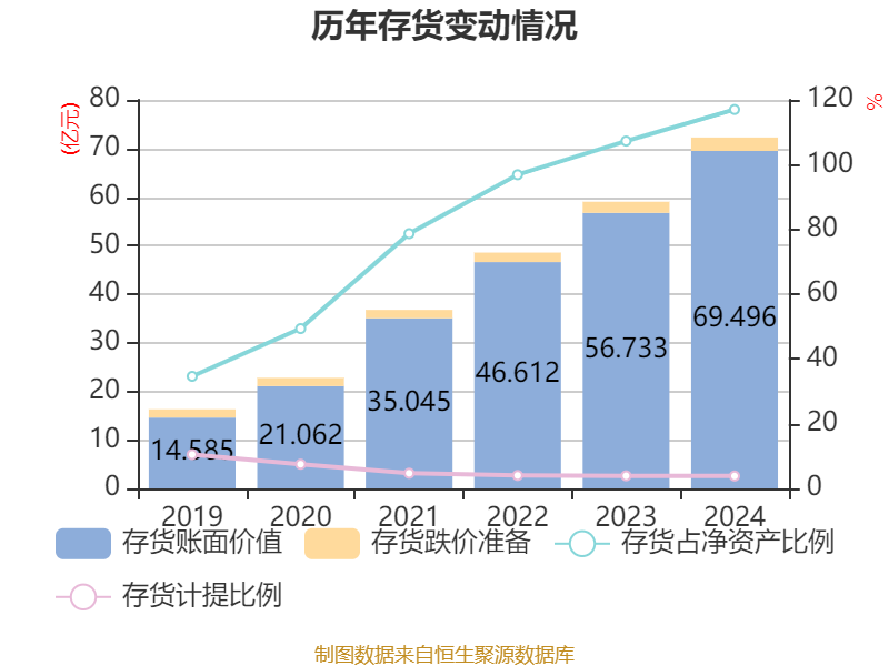 从存货变动来看,截至2024年末,公司存货账面价值为69.5亿元,占净资产的117.03%,较上年末增加12.76亿元。其中,存货跌价准备为2.76亿元,计提比例为3.83%。