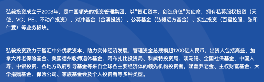 公开资料显示,弘毅投资成立于2003年,拥有私募股权投资(天使、VC、PE、不动产投资)、对冲基金(金涌投资)、公募基金(弘毅远方基金)、实业投资(百福控股、弘和仁爱)等业务板块。弘毅投资管理资金总规模超1200亿元,出资人包括高盛、加拿大养老保险基金、美国德州教师退休基金、阿布扎比投资局、科威特投资局、淡马锡等。