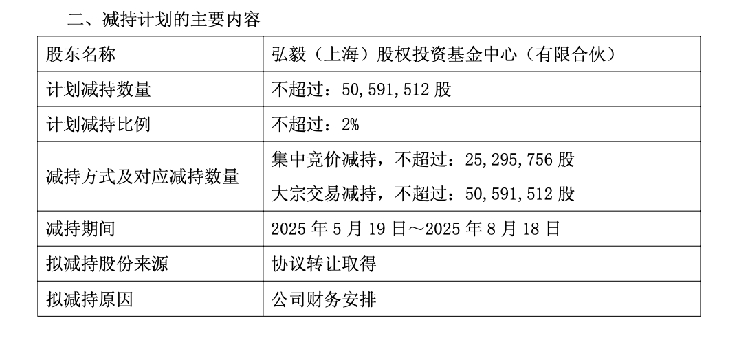 4月22日晚间,城投控股发布的公告显示,股东弘毅(上海)股权投资基金中心(有限合伙)计划自15个交易日后的3个月内,通过集中竞价交易、大宗交易等方式减持其持有的不超过5059.15万股公司股份,减持比例不超过公司总股本的2%。