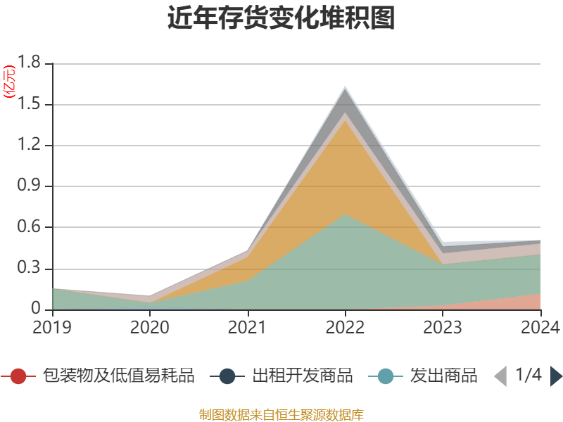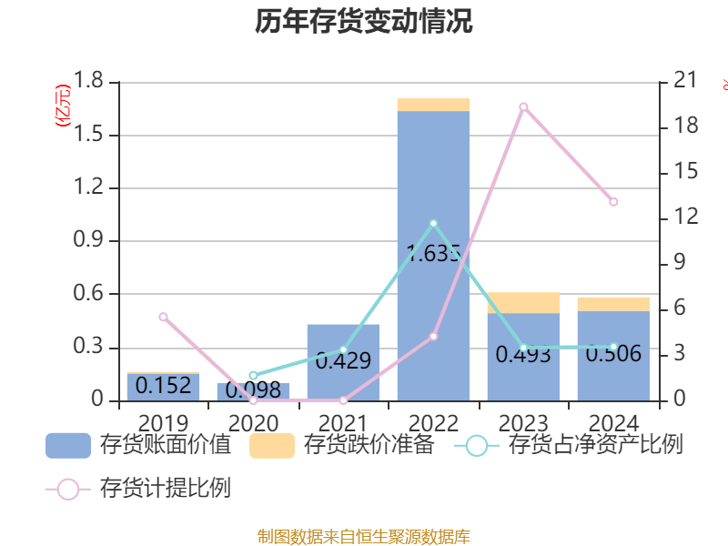 从存货变动来看,截至2024年末,公司存货账面价值为5061.97万元,占净资产的3.54%,较上年末增加130.59万元。其中,存货跌价准备为762.52万元,计提比例为13.09%。