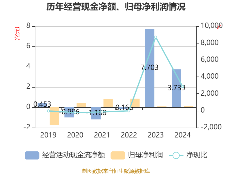 截至2024年,公司经营活动现金流净额为3.74亿元,同比下降51.47%;筹资活动现金流净额-1.27亿元,同比减少1.86亿元;投资活动现金流净额-3.6亿元,上年同期为-7.82亿元。