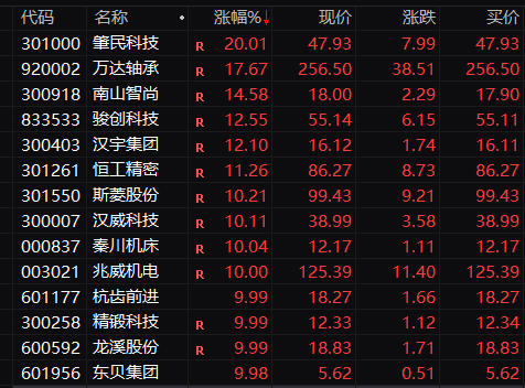 概念板块方面,人形机器人概念大涨,板块盘中涨幅超过4%。肇民科技20%涨停,万达轴承涨超17%,南山智尚涨超14%,骏创科技、汉宇集团涨超12%,秦川机床、兆威机电、杭齿前进、龙溪股份等多股涨停。