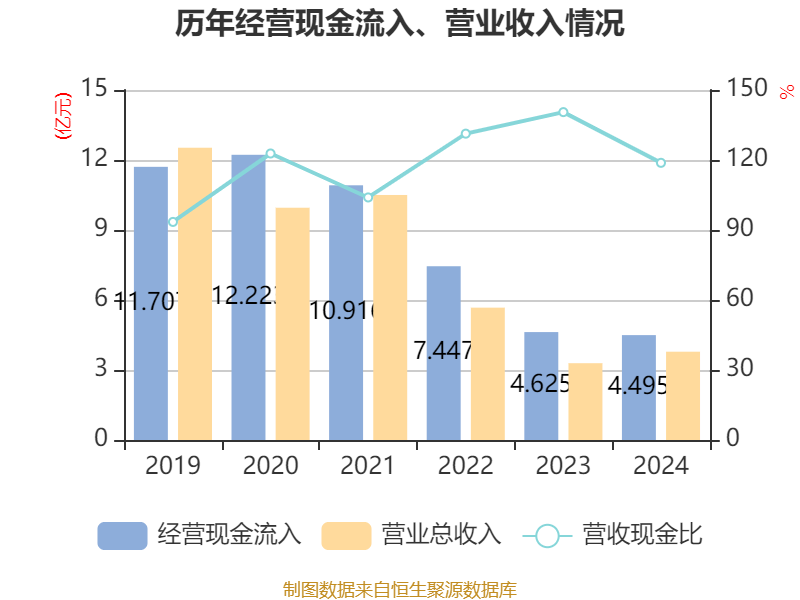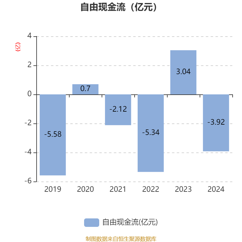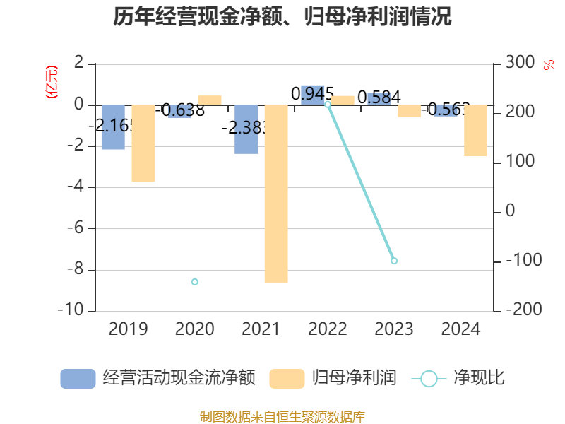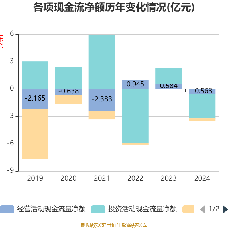 截至2024年,公司经营活动现金流净额为-5625.7万元,同比减少1.15亿元;筹资活动现金流净额-3404.09万元,同比减少3394.5万元;投资活动现金流净额-2.66亿元,上年同期为1.68亿元。
