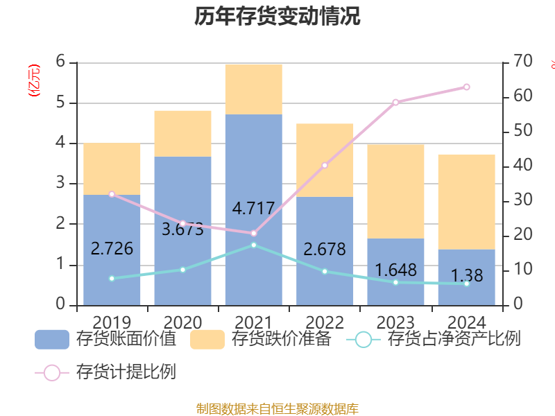从存货变动来看,截至2024年末,公司存货账面价值为1.38亿元,占净资产的6.17%,较上年末减少2673.85万元。其中,存货跌价准备为2.34亿元,计提比例为62.91%。