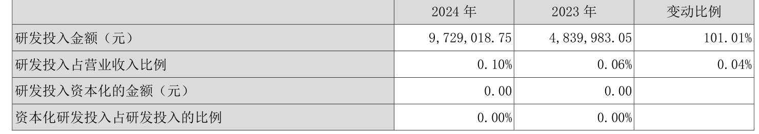 2024年全年,公司研发投入金额为972.9万元,同比增长101.01%;研发投入占营业收入比例为0.1%,相比上年同期上升0.04个百分点。此外,公司全年研发投入资本化率为0%。