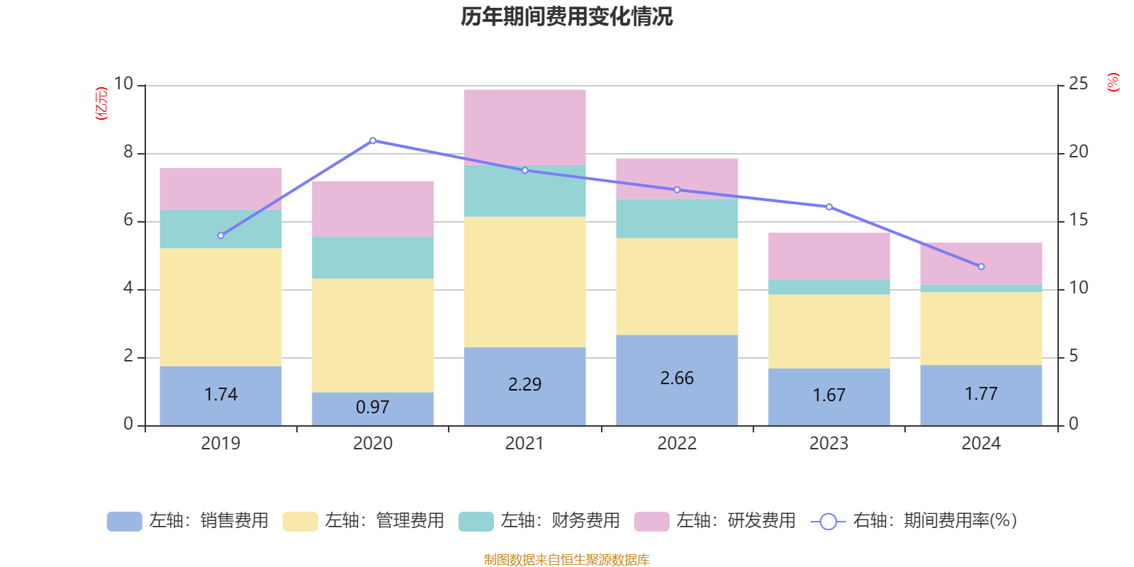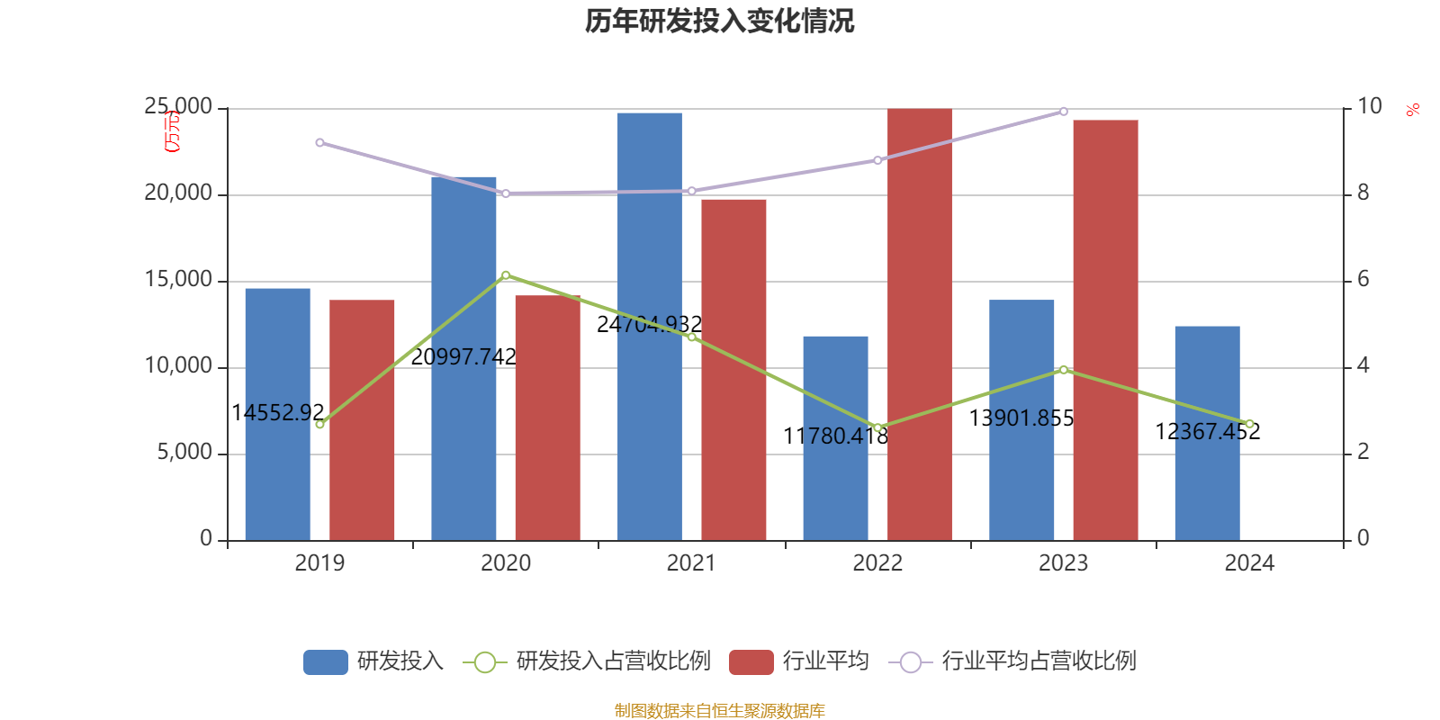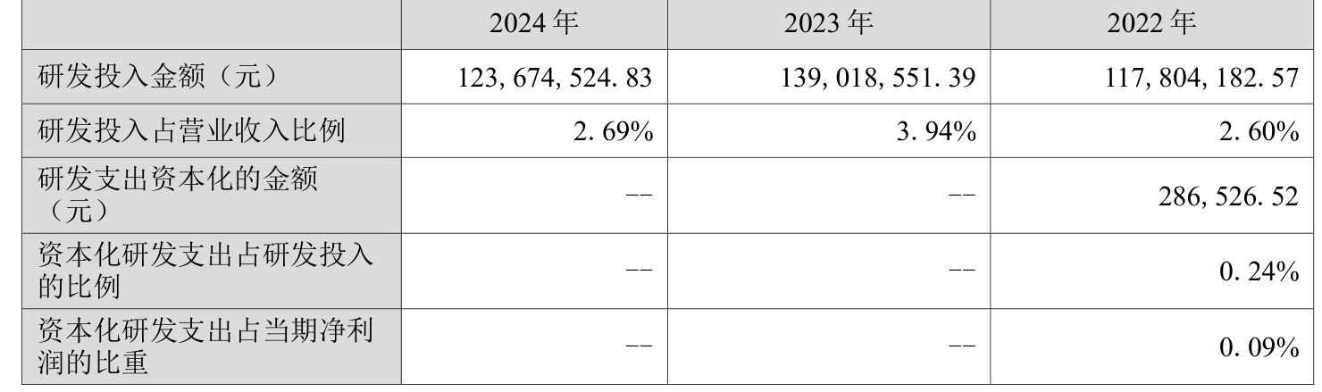 2024年全年,公司研发投入金额为1.24亿元,同比下降11.04%;研发投入占营业收入比例为2.69%,相比上年同期下降1.25个百分点。