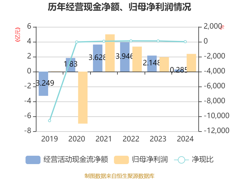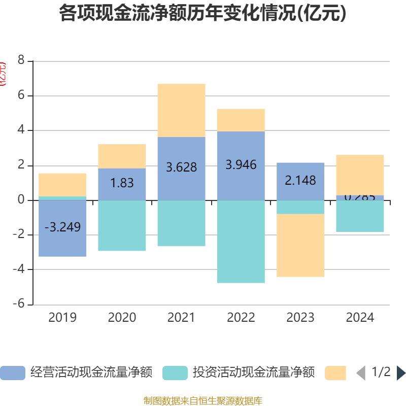截至2024年,公司经营活动现金流净额为2847.07万元,同比下降86.75%;筹资活动现金流净额2.31亿元,同比增加5.93亿元;投资活动现金流净额-1.83亿元,上年同期为-8018.02万元。