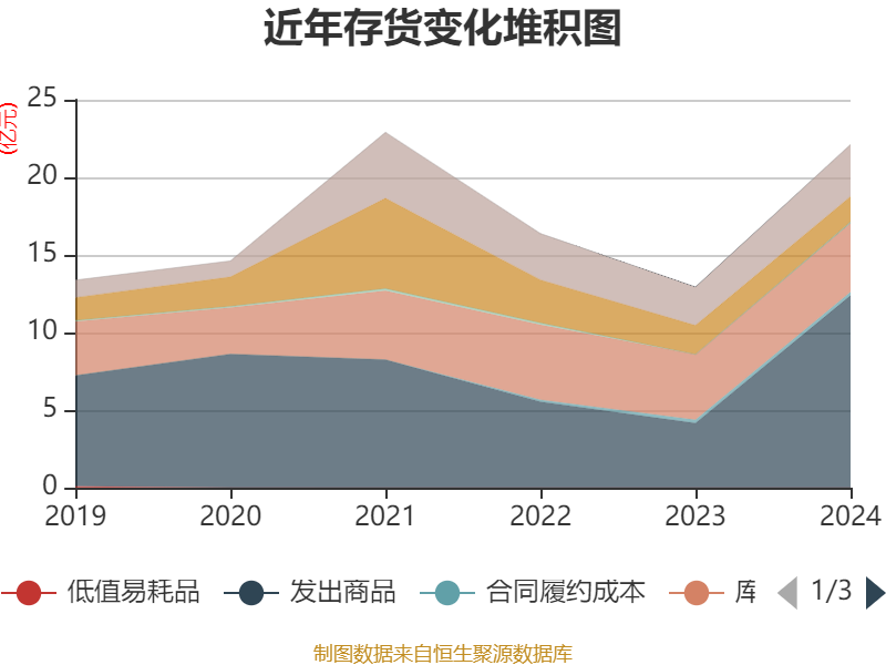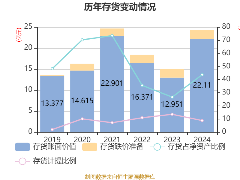 从存货变动来看,截至2024年末,公司存货账面价值为22.11亿元,占净资产的43.65%,较上年末增加9.16亿元。其中,存货跌价准备为2.11亿元,计提比例为8.71%。