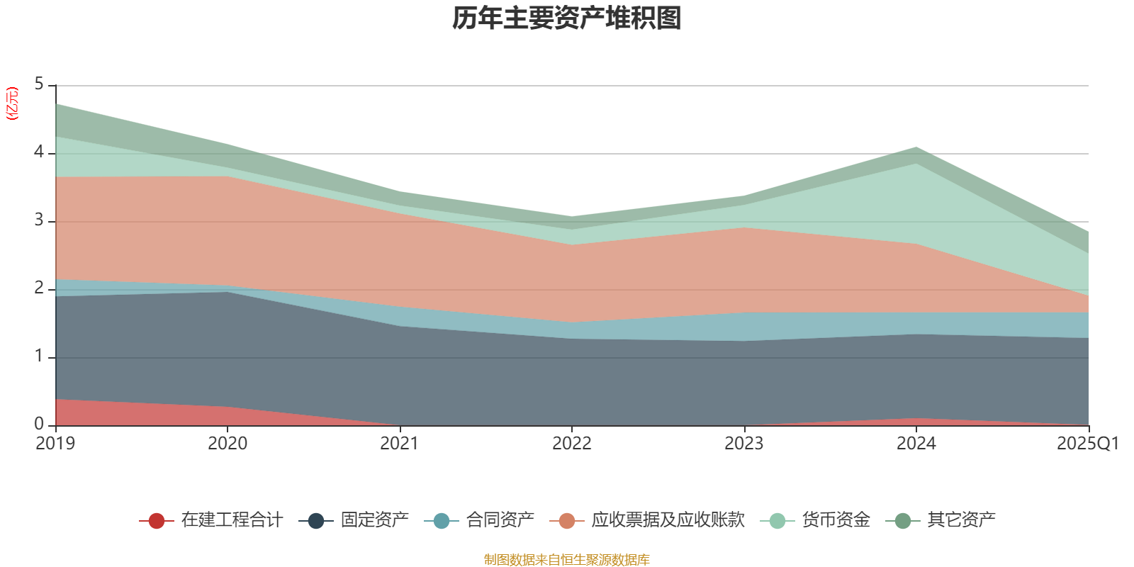 资产重大变化方面,截至2025年一季度末,公司应收票据及应收账款较上年末减少75.64%,占公司总资产比重下降15.98个百分点;固定资产较上年末增加3.39%,占公司总资产比重上升14.74个百分点;货币资金较上年末减少47.49%,占公司总资产比重下降7.05个百分点;合同资产较上年末增加17.45%,占公司总资产比重上升5.4个百分点。