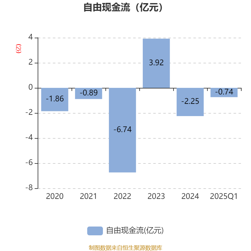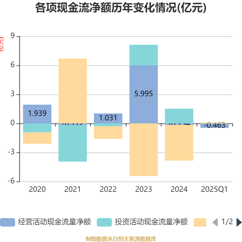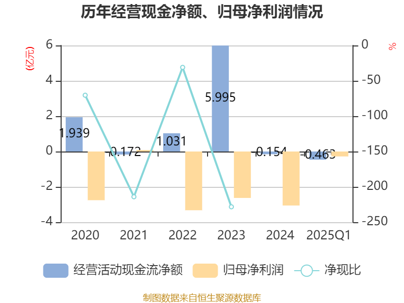 截至2025年一季度末,公司经营活动现金流净额为-4628.16万元,同比增加7038.56万元;筹资活动现金流净额963.35万元,同比减少2397.26万元;投资活动现金流净额4547.73元,上年同期为-5.82万元。