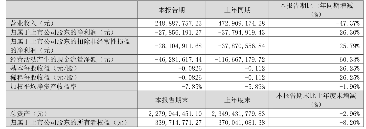 中证智能财讯中成股份(000151)4月24日披露2025年第一季度报告。公司实现营业总收入2.49亿元,同比下降47.37%;归母净利润亏损2785.62万元,上年同期亏损3779.49万元;扣非净利润亏损2810.49万元,上年同期亏损3787.06万元;经营活动产生的现金流量净额为-4628.16万元,上年同期为-1.17亿元;报告期内,中成股份基本每股收益为-0.0826元,加权平均净资产收益率为-7.85%。
